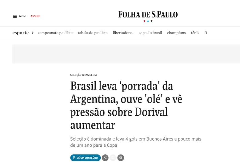 Asimismo, el medio deportivo Lance! profundiza: “Victoria histórica: Dorival dice que el plan contra Argentina fracasó y admite sentir presión”. “Brasil tiene el ‘peor primer tiempo de su historia’ en eliminatorias ante Argentina”, dice y menciona que la prensa argentina habla de “baile”.