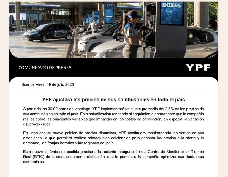 En otra tramo del escrito, la compañía que lidera Horacio Marín aclara: “En línea con su nueva política de precios dinámicos, YPF continuará monitoreando las ventas en sus estaciones, lo que permitirá realizar microajustes adicionales para adecuar los precios a la oferta y la demanda, las franjas horarias y las regiones”.
