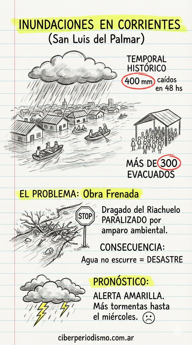 La provincia de Corrientes atraviesa horas críticas debido a un intenso temporal que ha golpeado con fuerza, especialmente a la localidad de San Luis del Palmar. Las cifras son alarmantes: en apenas 48 horas, cayeron cerca de 400 milímetros de lluvia, una cantidad que desbordó la capacidad de drenaje y dejó a gran parte del pueblo bajo el agua.
