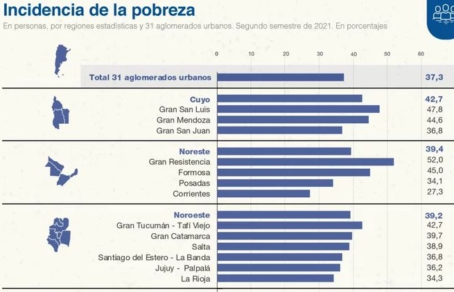 La mayor incidencia de la pobreza en personas se observó en las regiones de Cuyo (Gran San Luis, Gran Mendoza y Gran San Juan), con el 42,7%, Noreste o NEA (Gran Resistencia, Formosa, Posadas y Corrientes), con el 39,4% y Noroeste (Gran Tucumán, Gran Catamarca, Salta, Santiago del Estero, Jujuy, La Rioja), con el 39,2%. En el Gran Buenos Aires, que incluye a la Ciudad Autónoma de Buenos Aires, la pobreza llegó 37,3%.